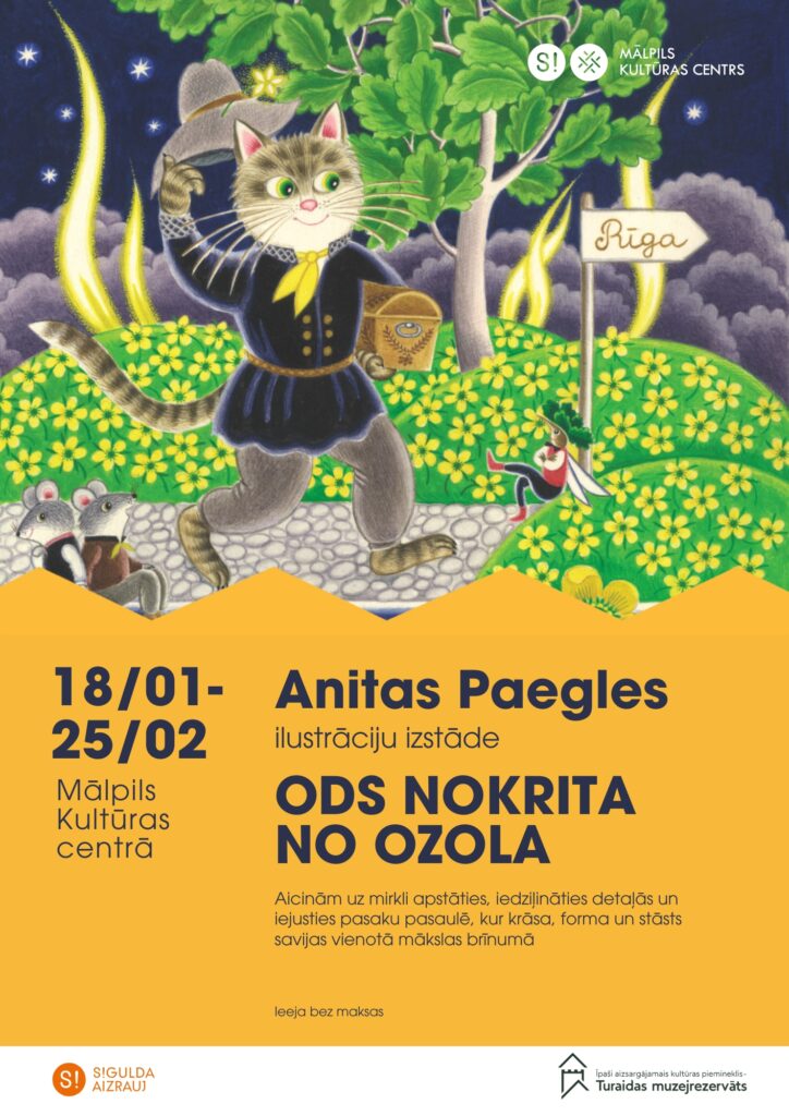 No svētdienas, 18. janvāra Mālpils Kultūras centra izstāžu zālē skatāma jauna izstāde – Anitas Paegles grāmatu ilustrācijas ODS NOKRITA NO OZOLA, kas tapusi sadarbībā ar Īpaši aizsargājamo kultūras pieminekli Turaidas muzejrezervāts.